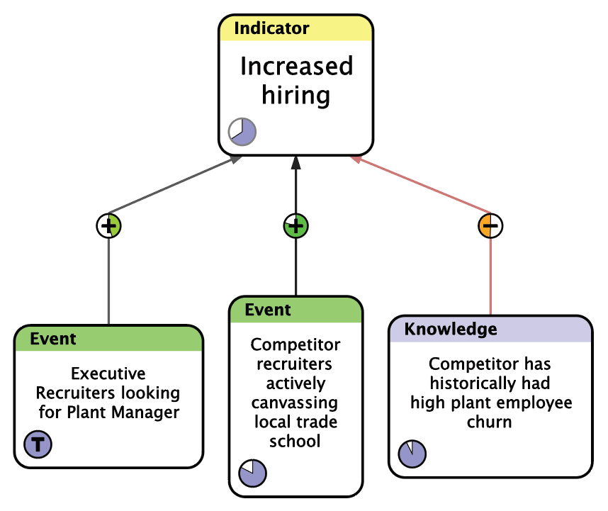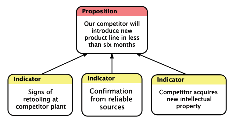 Indicators are potential causes for Propositions or other Indicators, and can be considered analogous to Intermediate Effects in Effects-Based Planning. Another way of thinking of Indicators is as inferred evidence. Each Proposition typically has a set of Indicators that feed into it, each of which is considered to be a possible cause of the Proposition, and which together form a “template” for recognizing that the Proposition holds (i.e., that the requirement has been met.)