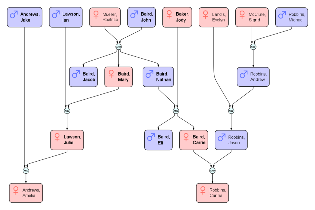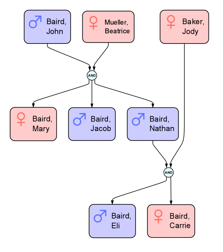 In the example above, Jason Robbins’ family is partway charted, with his father’s family being charted enough for Jason Robbins to line up with his partner, Carrie Baird